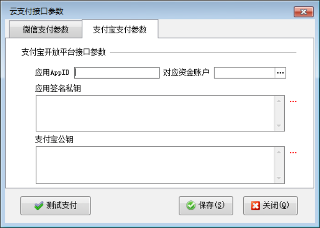 在功能導(dǎo)航窗選擇“擴(kuò)展應(yīng)用”—》“云支付參數(shù)”,可以設(shè)置支付寶和微信支付的參數(shù)信息。由于設(shè)置比較專業(yè),購買服務(wù)后可聯(lián)系客服協(xié)助配置參數(shù)。
