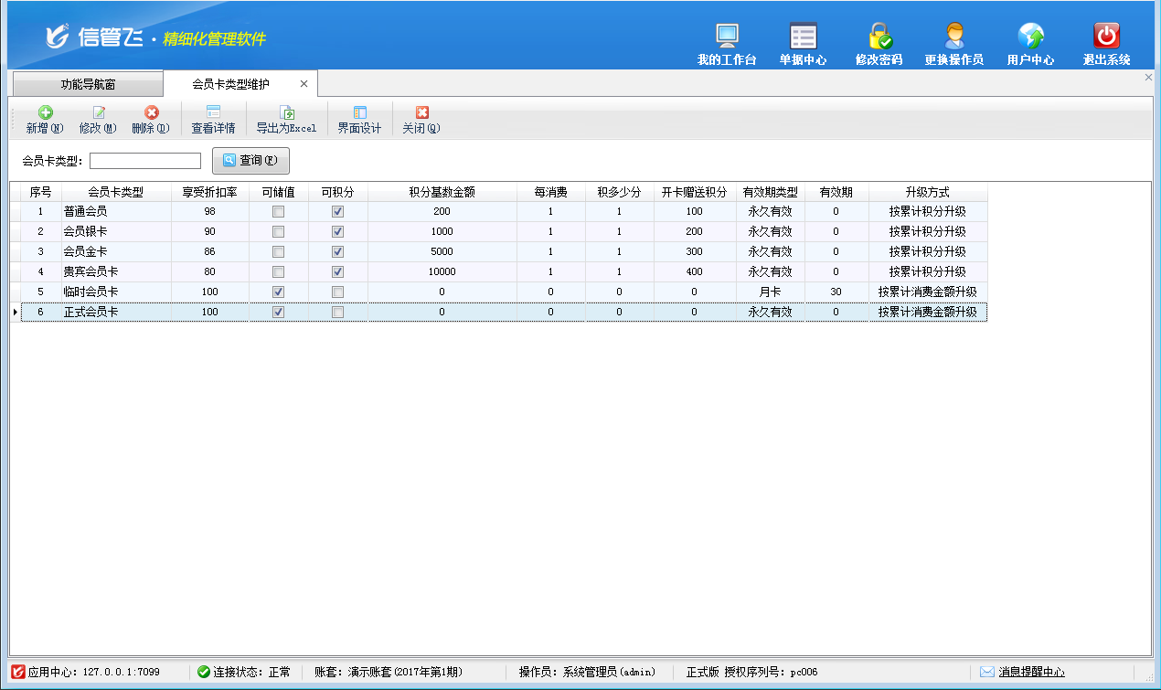 包括功能:會員卡類型維護、會員積分管理、會員儲值管理、調整會員儲值、調整會員積分、會員卡充值、積分兌換、會員卡補退換、會員卡掛失、會員卡禁用、會員讀卡器配置等。