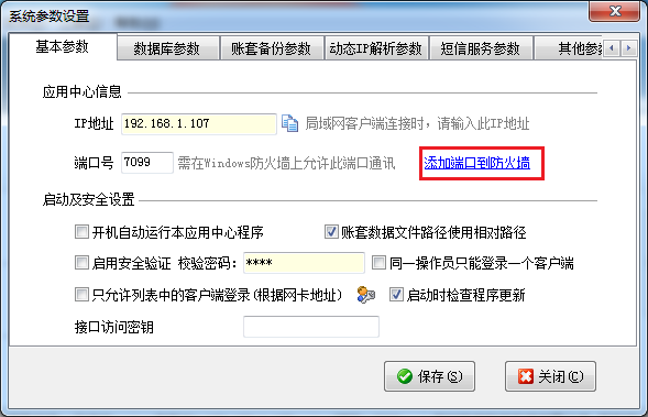 ????主機電腦的Windows防火墻或其他安全軟件的防火墻上需要開放相應的端口,軟件支持自動添加防火墻規則。在應用中心程序點“系統參數”可以設置自動添加端口到防火墻。