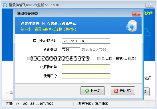 (2)互聯(lián)網(wǎng)遠(yuǎn)程使用:如果是通過互聯(lián)網(wǎng)遠(yuǎn)程連接(比如異地使用),軟件支持動(dòng)態(tài)IP解析服務(wù)和云應(yīng)用(云賬套)兩種方式(均為增值服務(wù),需按年付費(fèi))。購買后輸入我們提供的IP解析帳號(hào)、使用口令或通行證帳號(hào)、密碼,然后點(diǎn)“下一步”按鈕,選擇要登錄的賬套。