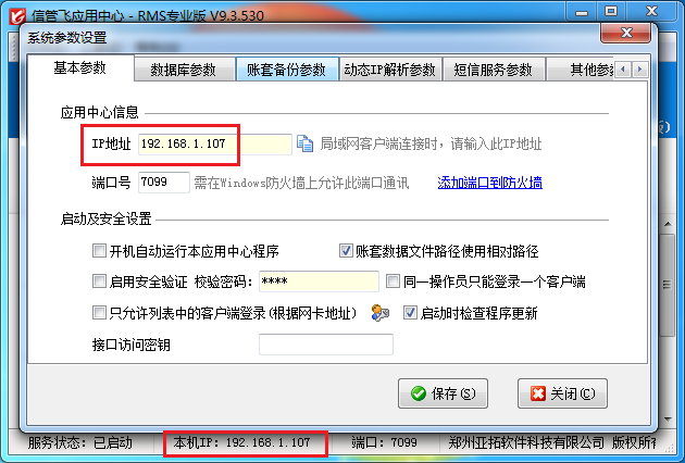 ????(1)應(yīng)用中心IP地址即主機(jī)電腦的IP地址,可以在主機(jī)上的應(yīng)用中心程序上查看(在狀態(tài)欄和系統(tǒng)參數(shù)設(shè)置中都可以看到),如下圖所示: