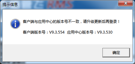 ????(4)客戶端程序登錄的時(shí)候,如果發(fā)現(xiàn)與主機(jī)電腦上的應(yīng)用中心程序版本號(hào)不一致,會(huì)提示如下信息,用相同版本的安裝程序安裝一下即可。