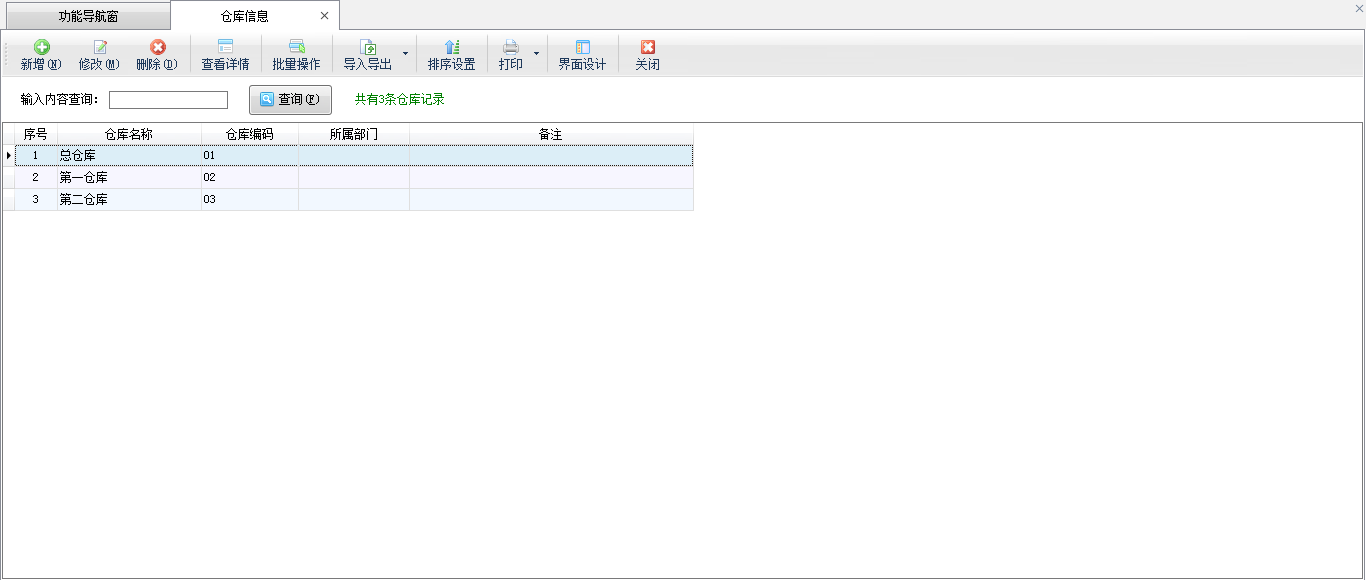 ????在功能導航窗點擊“基礎資料”—》“倉庫信息”,即可進入倉庫信息管理功能,其界面如下圖所示: