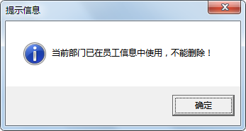刪除部門:對選定的部門信息進行刪除。如果部門已使用則不允許刪除,可以先將相應員工的所屬部門調整為其他部門,然后才可以刪除。