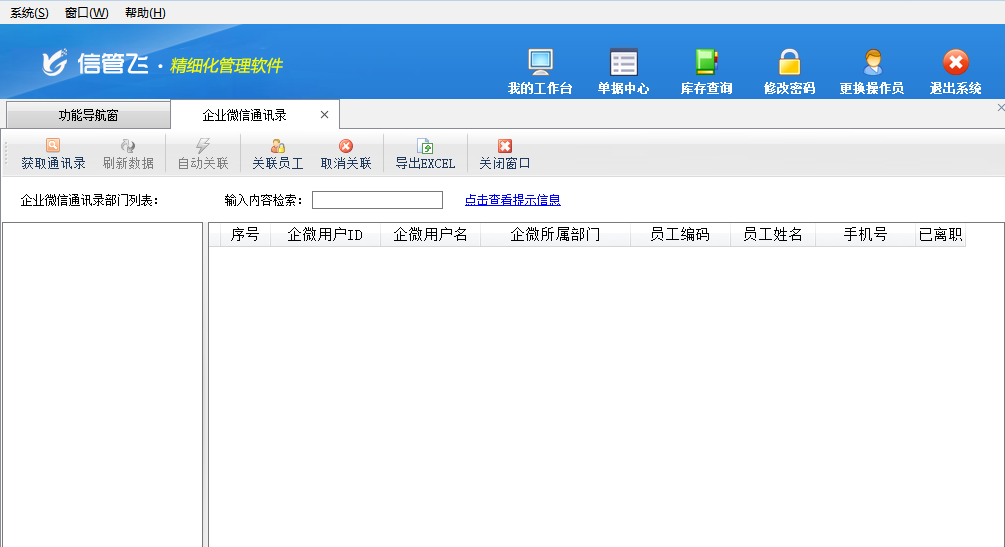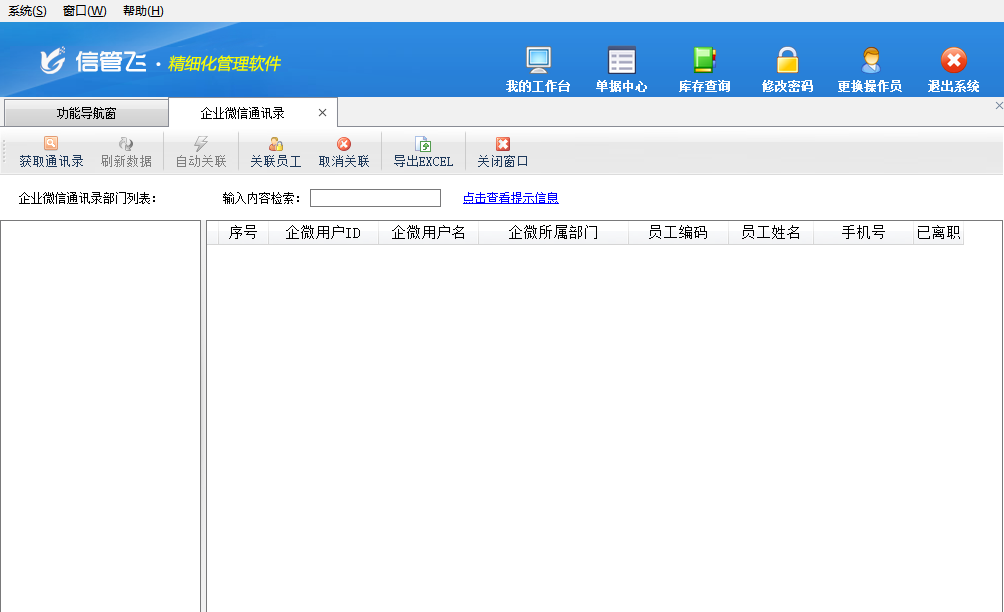 企微通訊錄:點擊“企微通訊錄”按鈕可以打開“企業微信通訊錄”窗口,可以獲取企業微信通訊錄信息。(企微通訊錄功能需要先在“擴展應用”—》“微信接口參數”內對“企業微信接口”配置后才可以使用。)
