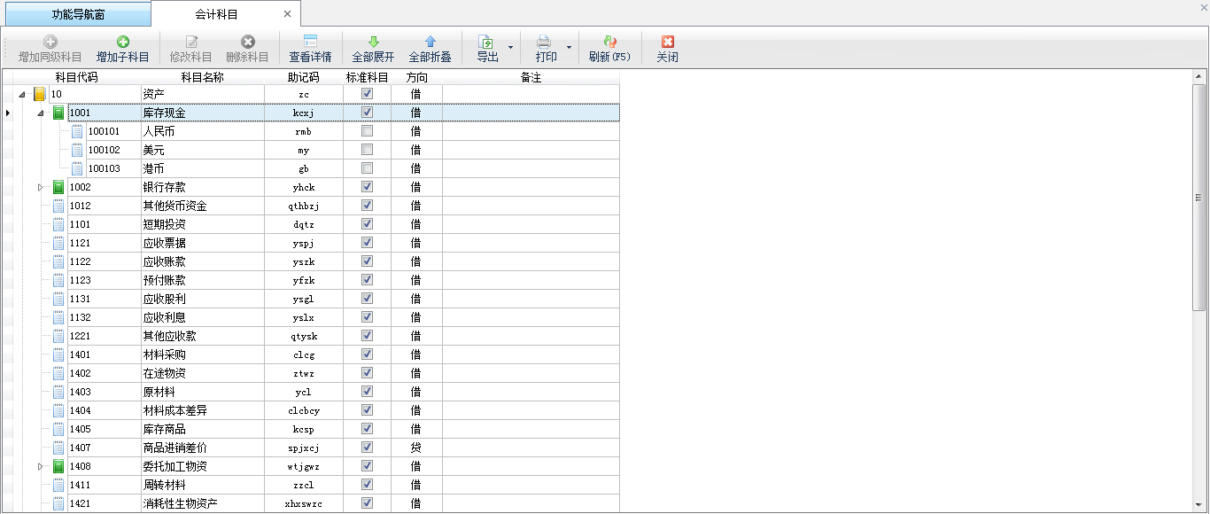 增加會計科目:點“增加同級科目”或“增加子科目”按鈕可以增加會計科目。增加科目的時候,請注意科目的方向。如默認資產類科目的方向為“借”,請根據情況修改調整。科目代碼會自動遞增,可根據需要進行修改調整。