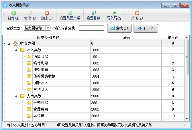 ????在功能導航窗點擊“基礎資料”—》“收支類別維護”,即可進入收支類別維護功能,其界面如下圖所示: