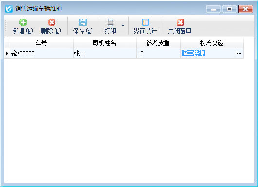 ????在功能導航窗點擊“基礎資料”—》“銷售運輸車輛”,即可進入運輸車輛維護功能,可以對運輸車輛及其參考皮重、司機姓名、所屬物流公司進行維護(有地磅稱重管理模塊即可使用此功能),其界面如下圖所示: