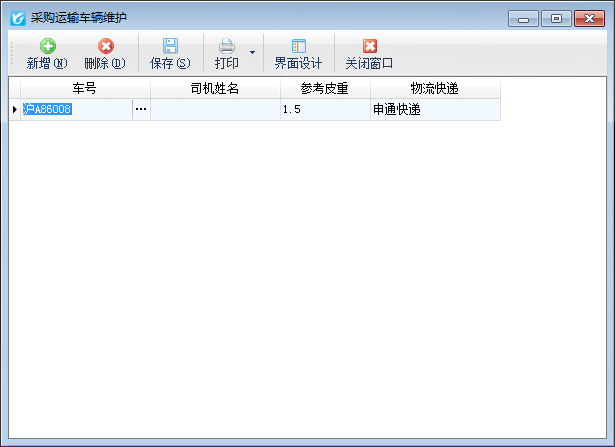 ????在功能導航窗點擊“基礎資料”—》“采購運輸車輛”,即可進入采購運輸車輛維護功能,可以對運輸車輛及其參考皮重、司機姓名、所屬物流公司進行維護(有地磅稱重管理模塊即可使用此功能),其界面如下圖所示: