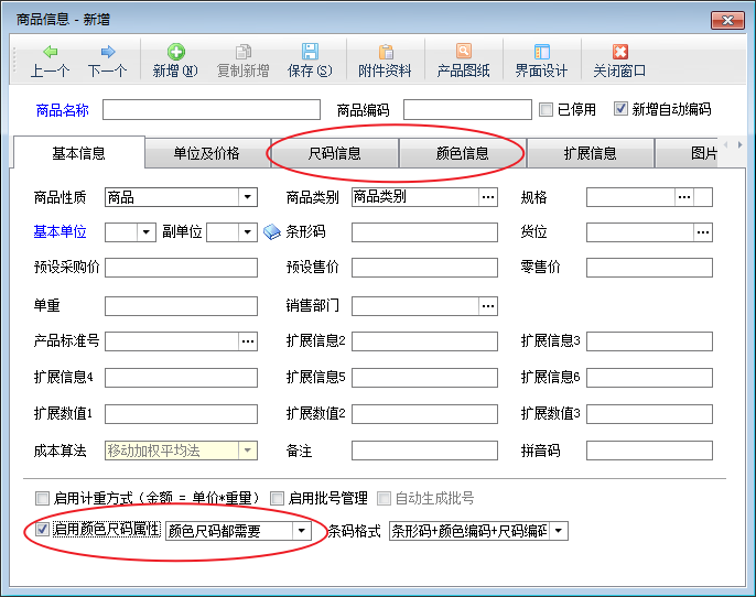 啟用顏色尺碼屬性:如果打勾選擇“啟用顏色尺碼屬性”,則該商品入庫和出庫時可以按顏色、尺碼進行快捷輸入。在倉庫庫存查詢中可以查詢分顏色尺碼顯示商品庫存。支持“只需要尺碼”、“只需要顏色”、“顏色尺碼都需要”三種管理方式。