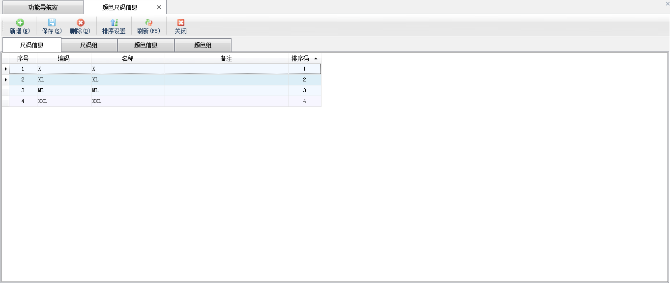 ????在功能導航窗點擊“基礎資料”—》“顏色尺碼信息”,即可進入顏色尺碼信息管理功能,其界面如下圖所示: