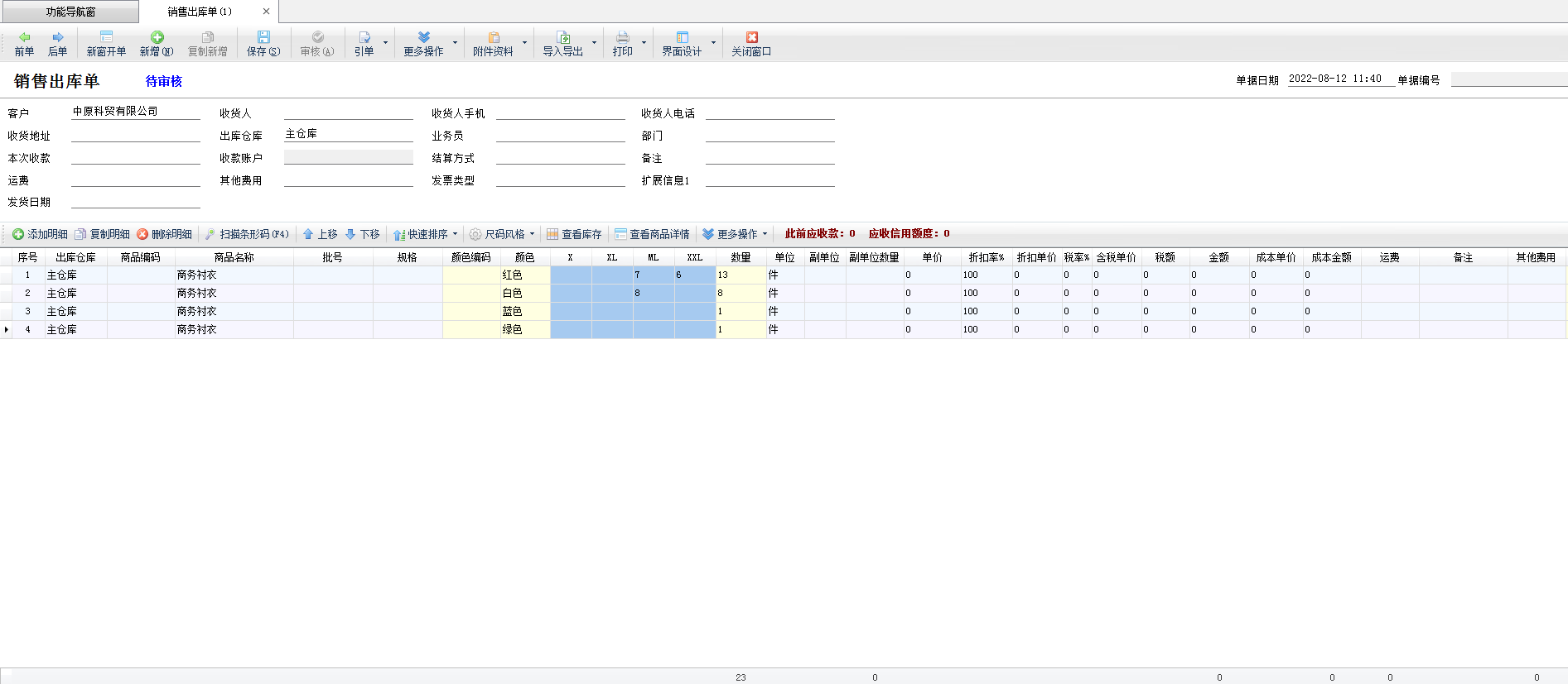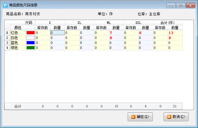 ????軟件支持按顏色組和尺碼組進行管理,方便不同的商品直接選擇不同的顏色尺碼組。在業務單據錄入時,軟件提供尺碼橫向錄入和彈出窗口錄入數量,如下圖所示: