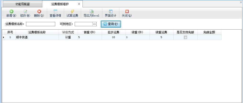 修改:在工具欄點擊“修改”按鈕選定的運費模板信息。