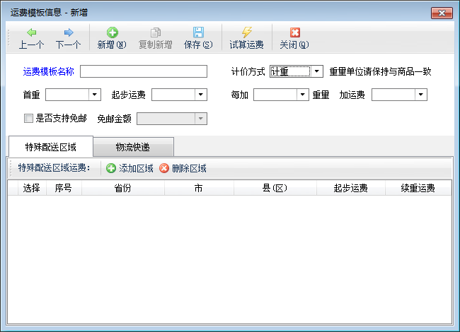 新增:在工具欄點擊“新增”按鈕可以新增運費模板信息,計價方式支持“計件”和“計重”兩種方式,特殊配送區域標簽頁可以添加特殊區域設置當前區域的起步運費和續重運費,物流快遞標簽頁可以添加使用此運費模板的物流快遞。