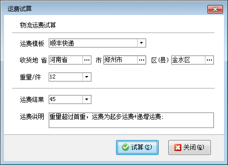 試算運費:在工具欄點擊“試算運費”按鈕可以打開試算運費窗口,在此窗口選擇運費模板后,輸入收貨區域以及重量/件數后可以自動根據選擇的運費模板計算運費。