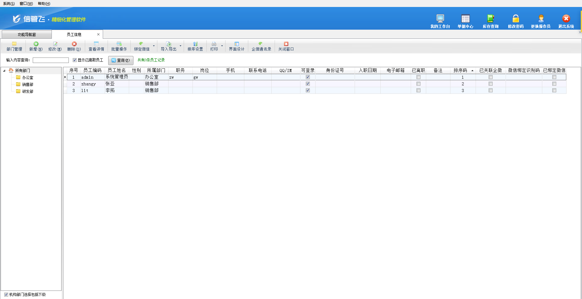 ????在功能導航窗中點擊“基礎資料”—》“員工信息”,即可進入“部門員工信息”維護功能,其界面如下圖所示: