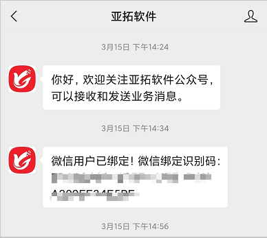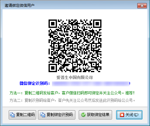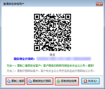 ????(1)選擇邀請綁定微信,會彈出邀請綁定微信用戶的二維碼,復制二維碼發給客戶,客戶微信掃碼即可關注并綁定公眾號,也可復制識別碼給客戶,客戶關注公眾號然后發送此識別碼給公眾號,成功綁定微信。