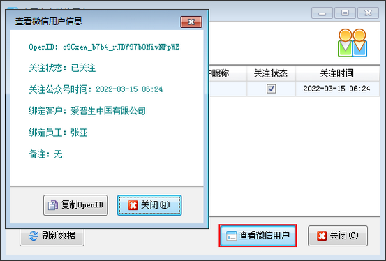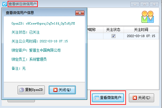 ????(2)選擇查看綁定微信用戶,可以查看綁定微信用戶的服務信息,點擊查看微信用戶,查看微信用戶的詳細信息。