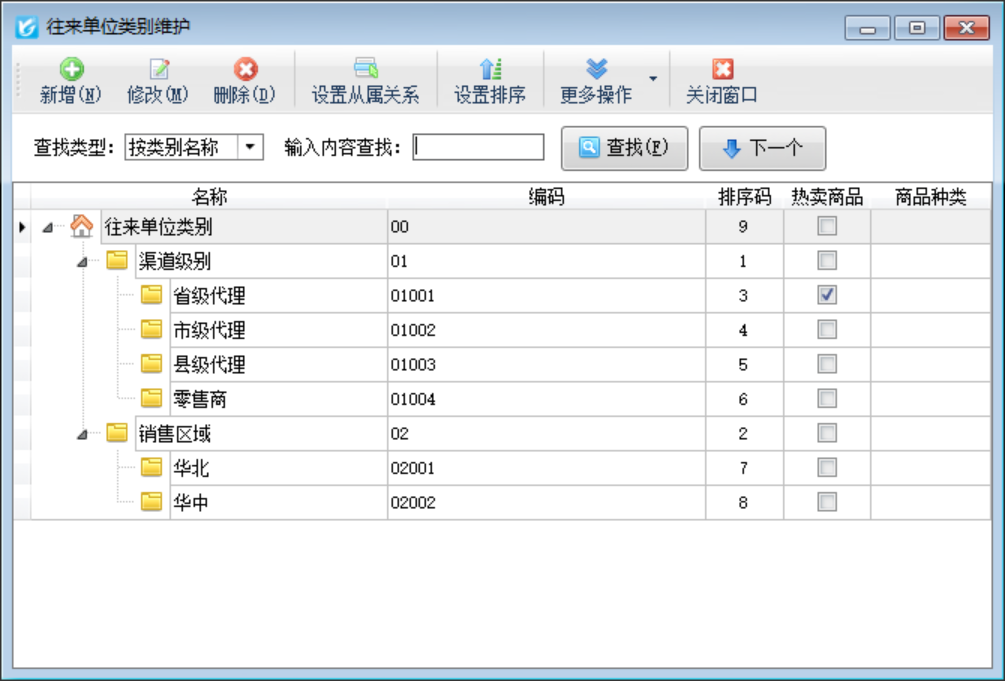 單位類別:點工具欄中的“單位類別”按鈕,可以維護往來單位類別。客戶資料和供應商資料共用“往來單位類別”。往來單位類別管理,包括維護單位類別、設置從屬關系、設置顯示順序(排序)、導入Excel數據等功能。