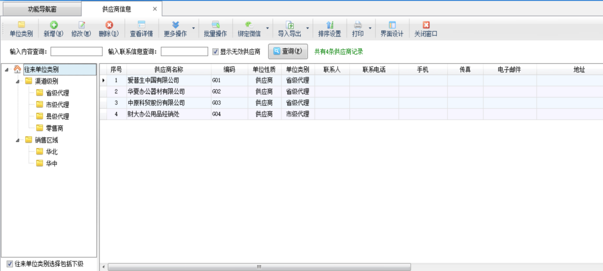 ????在功能導航窗中點擊“基礎資料”—》“供應商信息”,即可進入“供應商信息”功能,其界面如下圖所示: