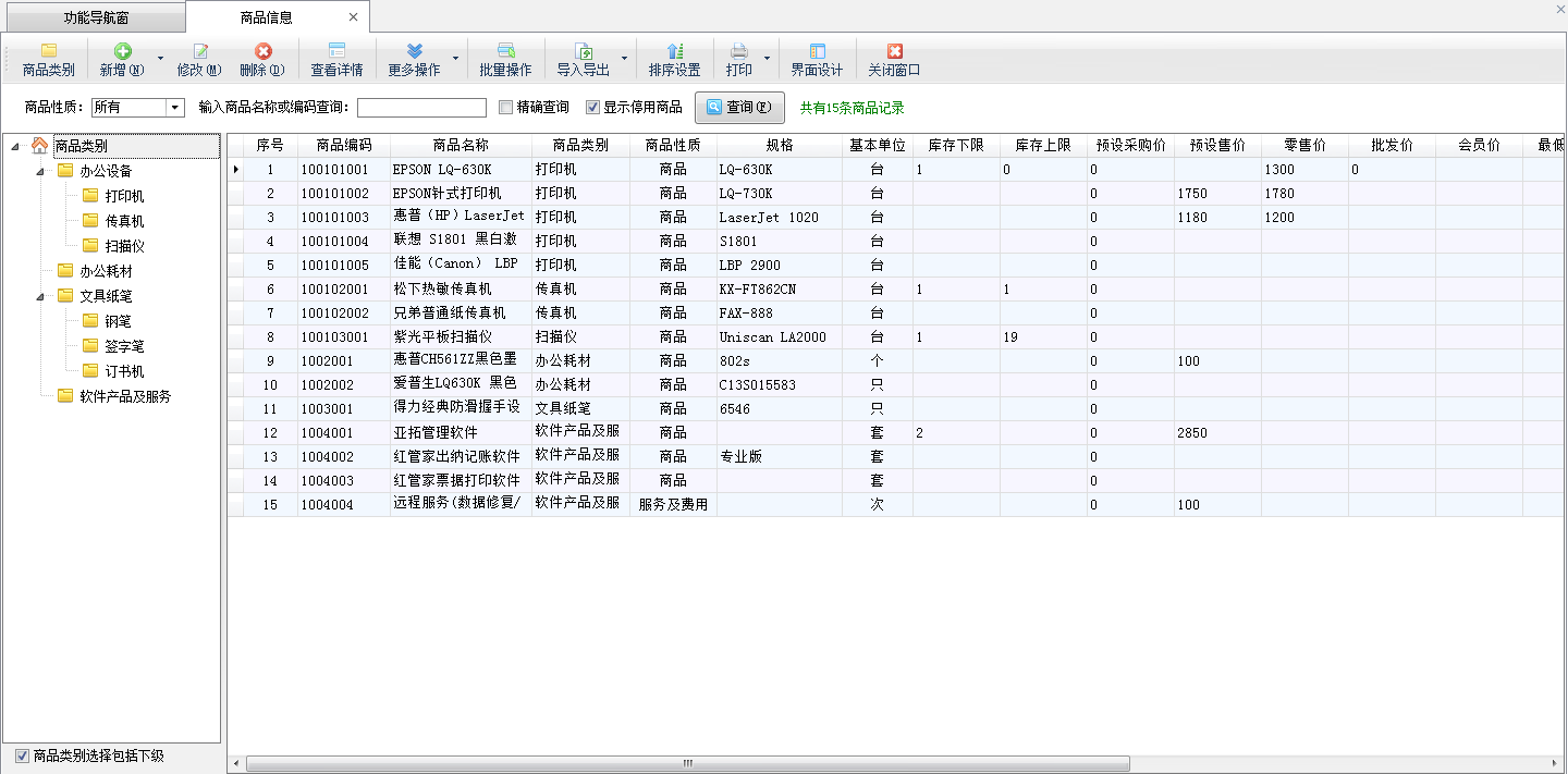 ????在功能導航窗點擊“基礎資料”—》“商品信息”,即可進入商品信息管理功能,其界面如下圖所示: