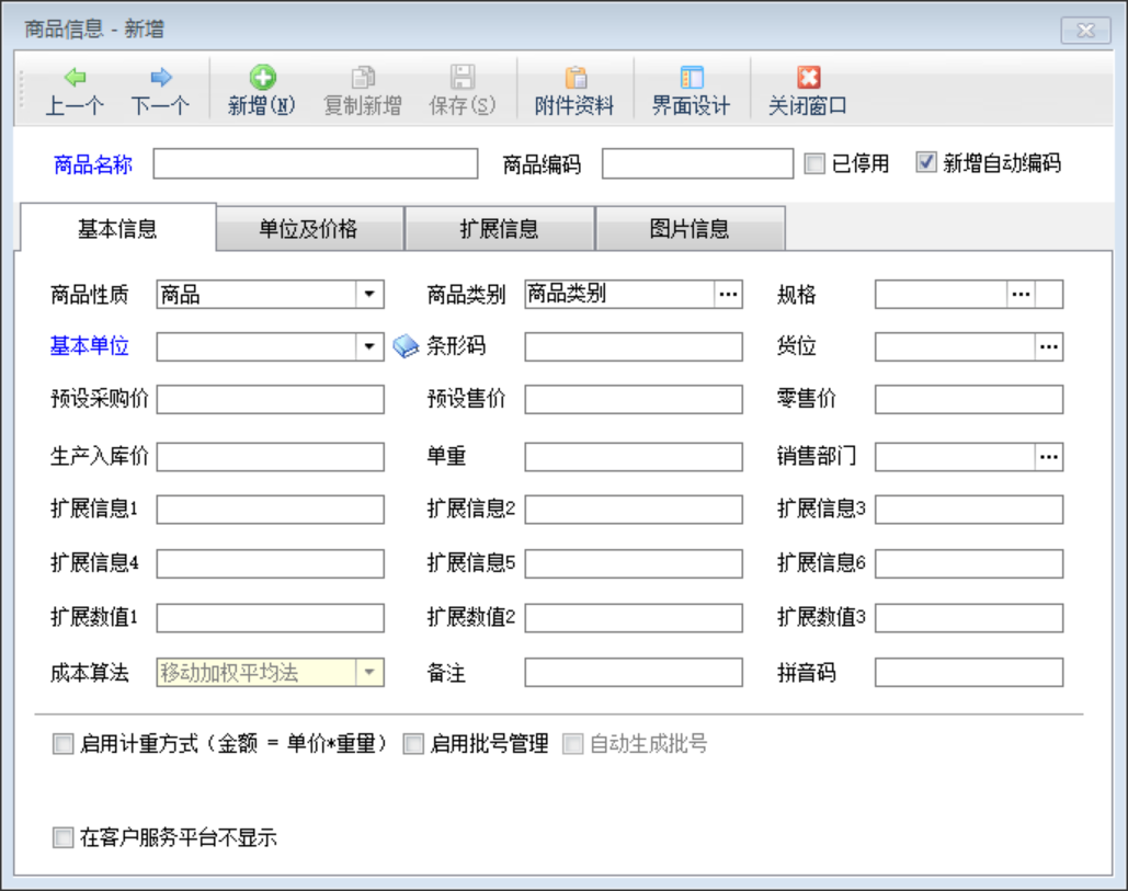 成本算法:軟件支持三種成本核算方法(移動加權平均法、先進先出法和手工指定法),每種商品都可選擇不同的成本核算方法,為減少軟件計算工作量,建議選擇相同的成本算法。