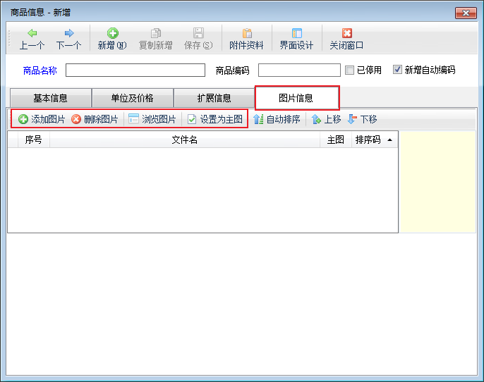 圖片信息:新增商品時,可以添加商品圖片,對添加的商品圖片進行瀏覽,刪除,排序等操作。