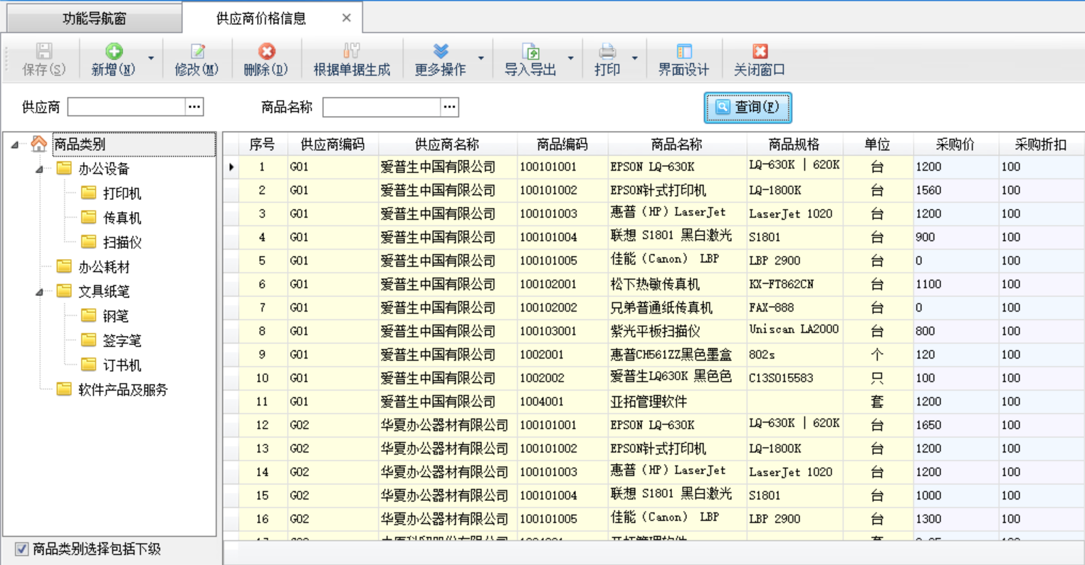 ????在功能導航窗點擊“基礎資料”—》“供應商價格信息”,即可進入“供應商價格信息”功能界面,其界面如下圖所示。