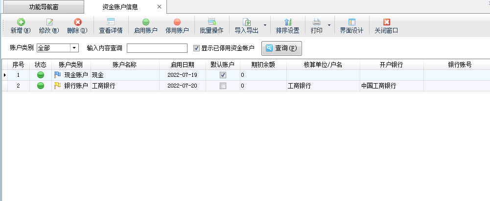 ????①資金賬戶必須對應“會計科目”中的庫存現金和銀行存款子科目,星光版和標準版由于沒有標準財務功能,不需要設置。