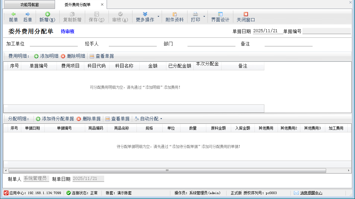 分配明細:可以選擇要分配的委外入庫單,點“自動分配”可以按照數量和金額進行分配。并可手工再進行調整,但是要注意,費用明細中的“本次分配金額”合計與分配明細中各個費用項目的總金額需要保持一致。