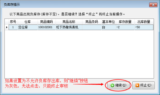 ????啟用“負(fù)庫存提示”時(shí),如果單據(jù)明細(xì)中的商品出現(xiàn)負(fù)庫存,則軟件彈出如下提示窗口。如果不允許負(fù)庫存出庫,則“繼續(xù)”按鈕為灰色無法點(diǎn)擊。