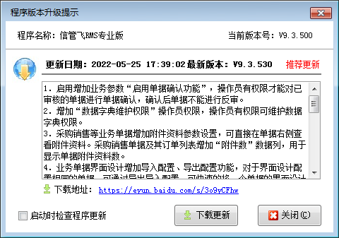 ????在功能導(dǎo)航窗點(diǎn)擊“系統(tǒng)管理”—》“升級(jí)更新”即可檢查程序更新,如有新版本,會(huì)彈出“程序版本升級(jí)提示”,點(diǎn)擊“下載更新”按鈕即可更新最新版本,其界面如下圖所示。