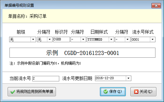 流水號(hào)規(guī)則設(shè)置:點(diǎn)工具欄中的“流水號(hào)規(guī)則設(shè)置”,可以配置單據(jù)流水號(hào)的生成規(guī)則。配置各類單據(jù)按各自流水號(hào)遞增,還是所有單據(jù)采用統(tǒng)一流水號(hào)遞增;流水號(hào)每年、每月、每天從 1 遞增,還是一直遞增。