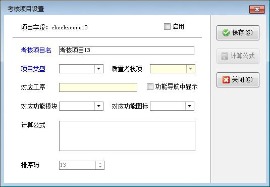 設(shè)置考核項(xiàng)目:在工具欄點(diǎn)擊“設(shè)置項(xiàng)目”,可以打開“考核項(xiàng)目設(shè)置”界面,可以設(shè)置考核項(xiàng)目名、項(xiàng)目類型(工序考核項(xiàng)、質(zhì)量考核項(xiàng)、輸入項(xiàng)、計算匯總項(xiàng))及考核項(xiàng)目否需要在功能導(dǎo)航中顯示等。如下圖所示: