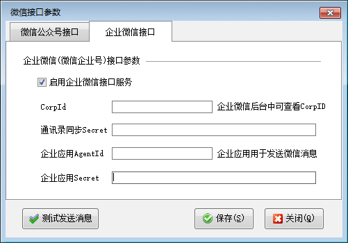 ????在功能導航窗點擊“擴展應用”—》“微信接口參數”可以打開微信接口參數設置窗口,可以設置微信消息服務接口參數以及企業微信接口參數。