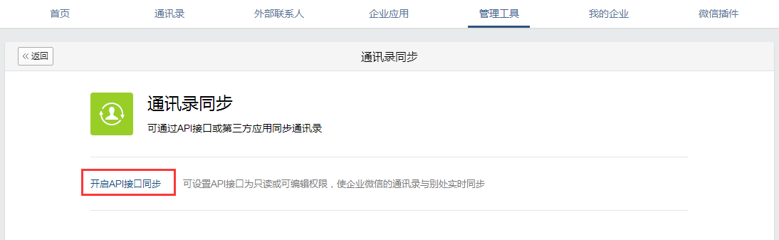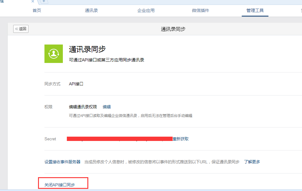 ????通訊錄同步Secret:在企業微信內點擊“管理工具”—》“通訊錄同步”,在通訊錄同步界面開啟API接口同步,開啟后可以查看通訊錄同步Secret。
