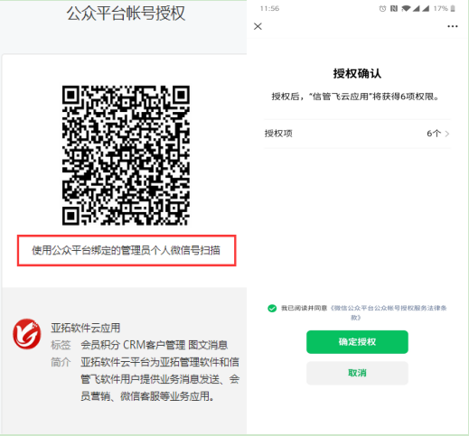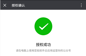 ????點擊“微信公眾號授權”會彈出公眾平臺賬號授權二維碼。使用公眾平臺綁定的管理員個人微信號進行掃描。會在手機微信上彈出一個授權確認界面,把微信公眾號授權給亞拓軟件云應用。如下圖所示: