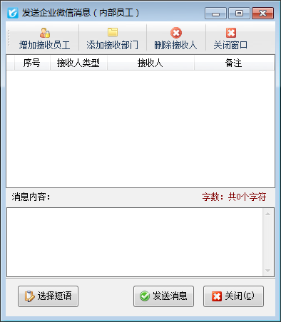 ????在功能導航窗點擊“擴展應用”—》“發送企微消息”可以打開發送企業微信消息窗口,可以編輯消息內容對企業內部員工發送微信企業消息,其界面如下圖所示。