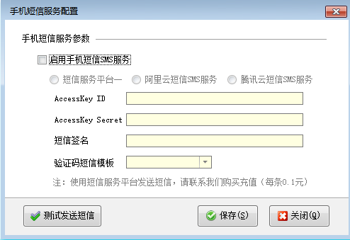 短信配置:在工具欄點擊“短信配置”按鈕,可啟用手機短信服務。支持短信服務平臺、阿里云短信SMS服務、騰訊云短信SMS服務。如下圖所示: