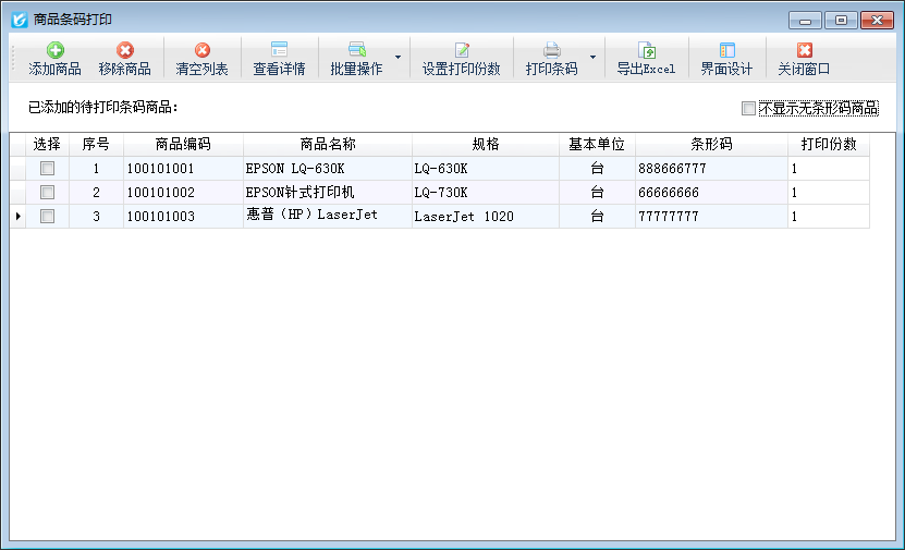 批量操作:在工具欄點擊“批量操作”按鈕,可以進入批量操作模式,復選多個商品信息,執行批量移除商品、批量設置打印份數等操作。