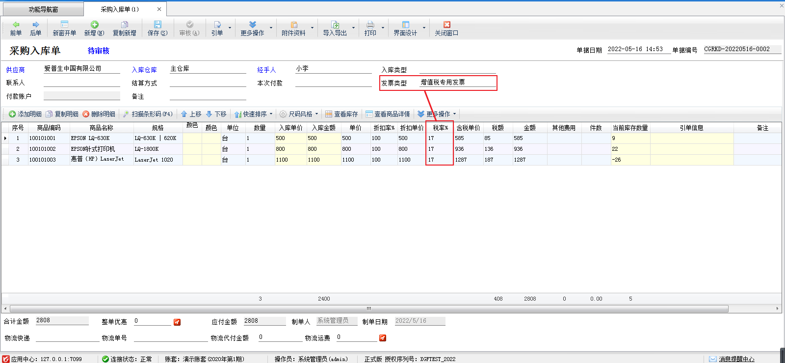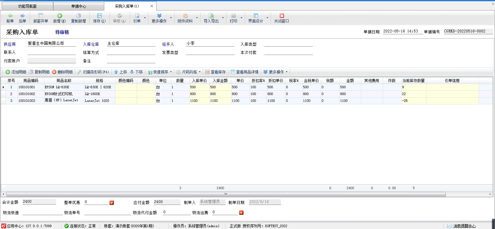 ????采購入庫單是采購貨品入庫的重要單據,采購入庫單保存審核后,采購貨物實際入庫,相應商品的庫存數量增加,并生成相應的應付款,是商品入庫和成本確認的重要依據。此外,采購入庫單也支持現款提貨以及物流代付款業務。