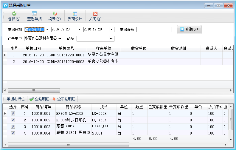 查詢:可以根據單據日期、單據狀態、打印狀態、單據編號、供應商、經手人、單據類別等條件查詢業務單據。
