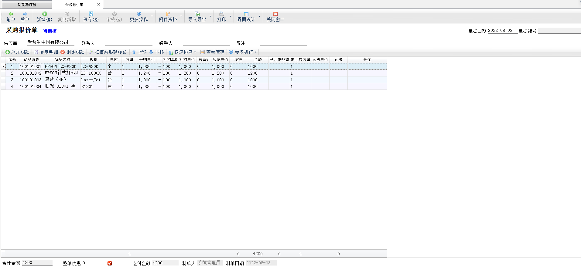 ????在功能導航窗點“采購管理”—》“采購報價單”即可進入“采購報價單”界面,如下圖所示: