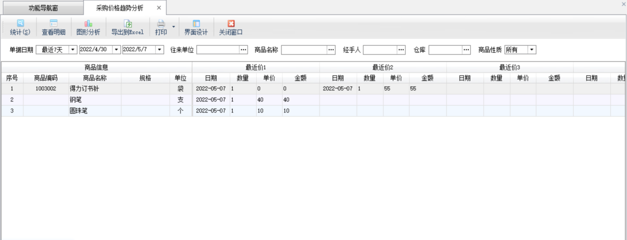 采購價格趨勢分析:可以匯總某個時間段內,每種商品的最近價以及每種商品每個開單日期的數量、單價、金額。支持按單據日期、往來單位、商品名稱、經手人、倉庫、商品性質等條件進行查詢。