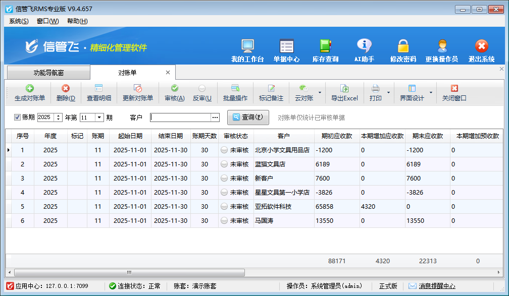 審核:點工具欄中的“審核”按鈕,可以對“待審核”的對賬單進行審核,已審核的對賬單不允許隨意修改,如需修改清先進行反審。
