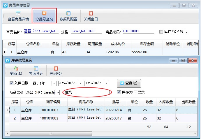 查看庫存:選擇單據明細中的商品記錄,點“查看庫存”按鈕可以查看當前商品的庫存情況,如果商品啟用批號管理支持分批號查詢庫存。