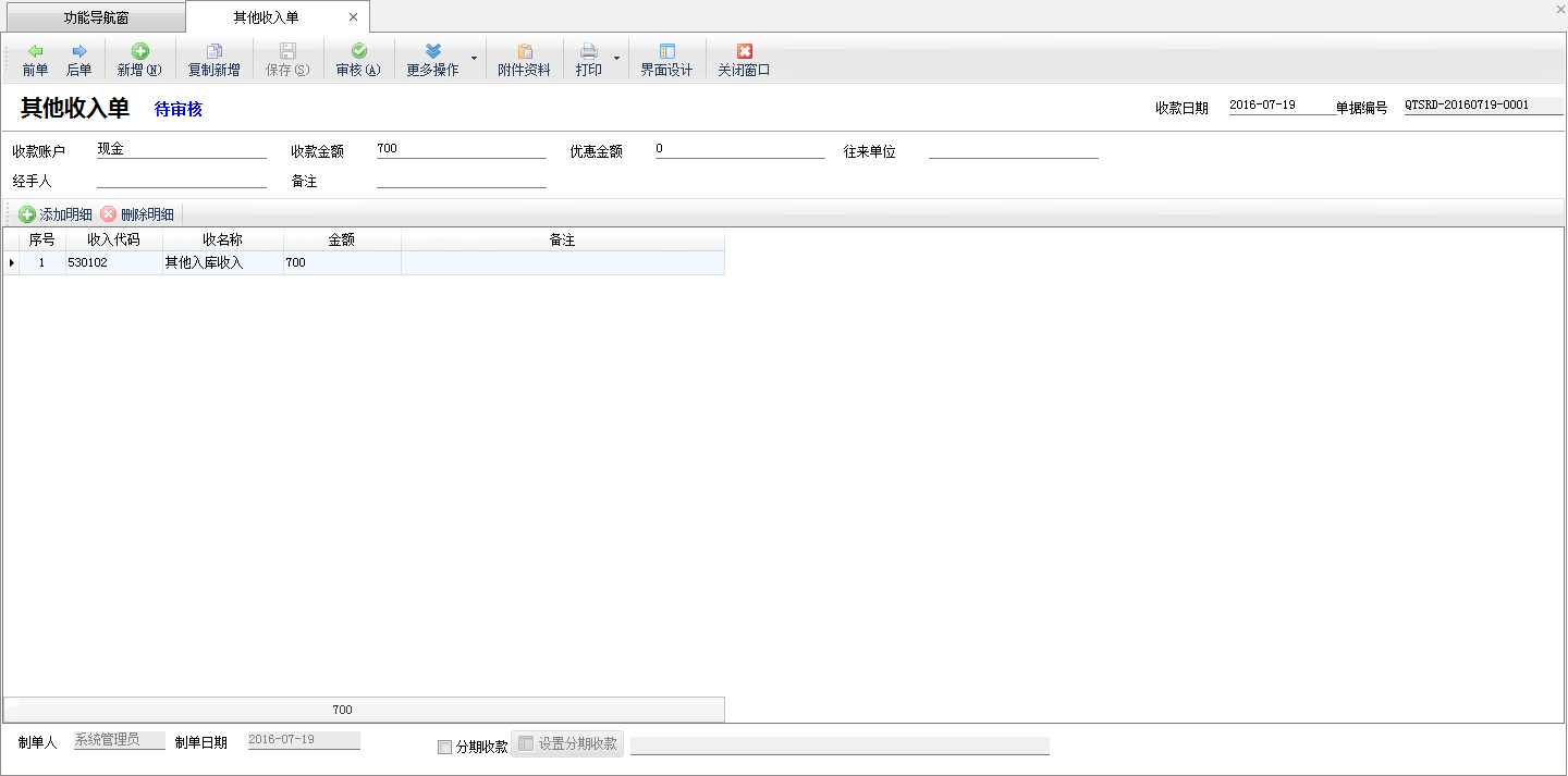 ????在功能導航窗,點“財務處理”—》“其他收入單”,即可進入其他收入單界面,如下圖所示: