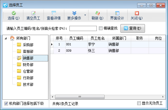 ????在選擇員工窗口,可以在輸入框中輸入人員的姓名或者拼音碼(即拼音頭)進行檢索。選擇查找到的人員,然后點擊“選擇”按鈕,或者直接雙擊記錄即可。