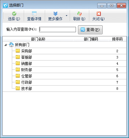 所屬部門:非必填項,選擇員工后,系統自動會填寫入該員工的部門。如需要修改,請點擊“選擇部門”按鈕,系統彈出“選擇部門”窗口,如下圖所示: