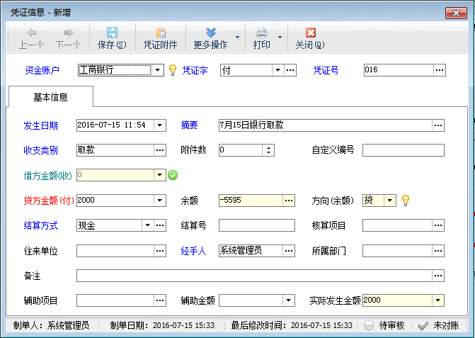 貸方金額:如果憑證字為“付”,則貸方金額必須填寫。貸方為支出,余額減少。